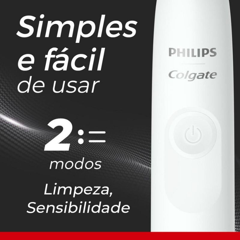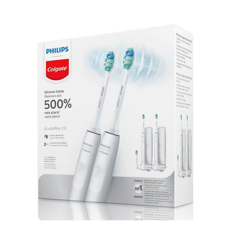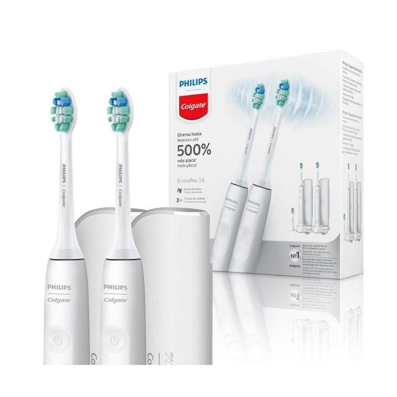 Escova Dental Elétrica Colgate Series 35 com tecnologia sônica, bateria recarregável de íon-lítio, sensor de pressão, dois modos de escovação (Limpeza e Sensibilidade) e corpo 100% à prova d’água. Compatível com refil Philips e Philips Colgate