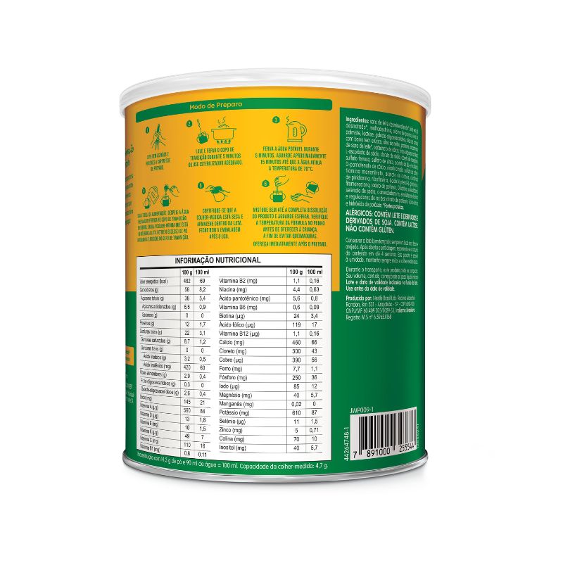 Leite parcialmente desnatado, Maltodextrina, Soro de Leite desproteinizado desmineralizado, Soro do Leite, Galacto-oligossacarídeos, Óleo de Milho, Óleo de Canola com baixo teor erúcico, Oleína de Palma, Cálcio (Carbonato de Cálcio) Fósforo (Fosfato de Potássio Dibásico), Fruto-oligossacarídeos, vitamina c (Ácido L-Ascórbico), Zinco (Sulfato de Zinco), vitamina e (Acetato de DL-alfa-tocoferila), Niacina (Nicotinamida), Ácido Pantotênico (D-pantotenato de Cálcio), Vitamina B1 (Tiamina Mononitrato), Vitamina B6 (Cloridrato de Piridoxina), Vitamina A (Acetato de Retinila), Vitamina B2 (Riboflavina), Ácido Fólico (Ácido N-pteroil-L-glutâmico), Selênio (Selenito de Sódio), Vitamina K (Fitomenadiona), Biotina (D-biotina), vitamina d (Colecalciferol), Vitamina B12 (Cianocobalamina), Ferro (Sulfato Ferroso), Emulsificante Lecitina de Soja, e Reguladores de Acidez (Citrato de Potássio, Ácido Cítrico e Hidróxido de Potássio). A lista de ingredientes usados na composição pode ser alterada pelo fabricante. Desta forma, recomendamos que você sempre leia a lista de ingredientes na embalagem do produto para garantir que são adequados para seu uso
