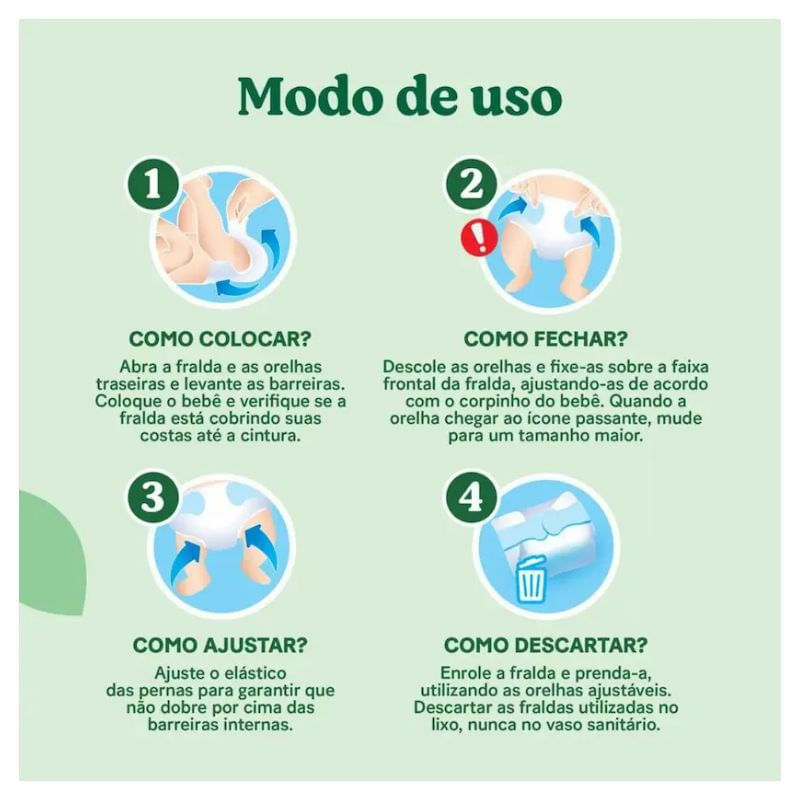 Coloque a fralda passando pelas pernas do bebê e ajuste na cintura. Para remover, abra as abas laterais e descarte após o uso