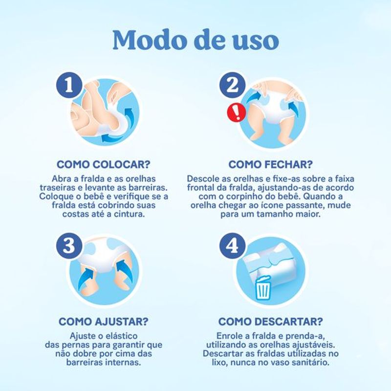 Coloque a fralda passando pelas pernas do bebê e ajuste na cintura. Para remover, abra as abas laterais e descarte após o uso