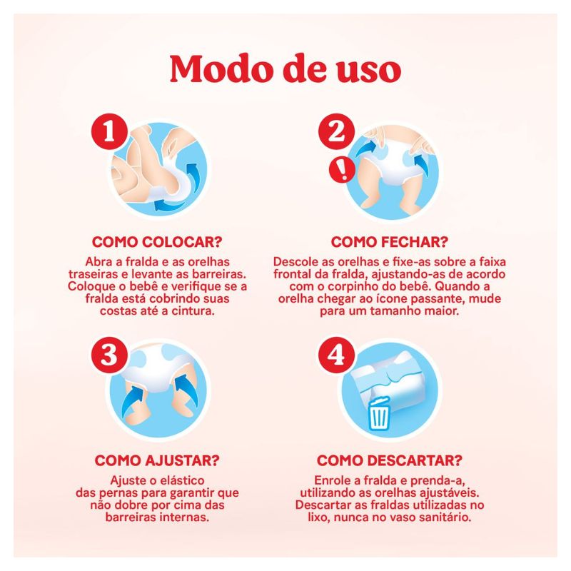 Coloque a fralda passando pelas pernas do bebê e ajuste na cintura. Para remover, abra as abas laterais e descarte após o uso