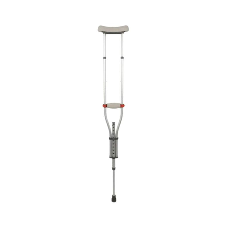 Ajuste a altura total com os pinos de clique laterais e a altura do apoio de mão removendo os pinos vermelhos. O apoio axilar deve ficar 2 a 3 dedos (aprox. 5cm) abaixo da axila para evitar lesões