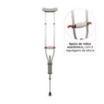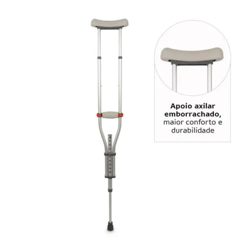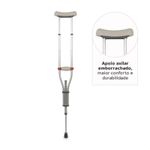 Indicada para pessoas com altura entre 1,34 m e 1,98 m; Leveza, facilidade ao manusear; Ponteira de borracha com anel metálico interno garante maior durabilidade, maior aderência ao solo e marcha mais silenciosa; Apoio axilar removível, lavável e vendido separadamente, facilitando a substituição caso seja necessário. Cor: Cinza e alumínio Composição: Alumínio estrutural com anodização fosca e apoio de mão em TPR e apoio de axila recoberto em EVA, pino click em aço. Muleta 3 tamanhos em um, ponteira de apoio resistente com textura que contribui para maior aderência ao solo