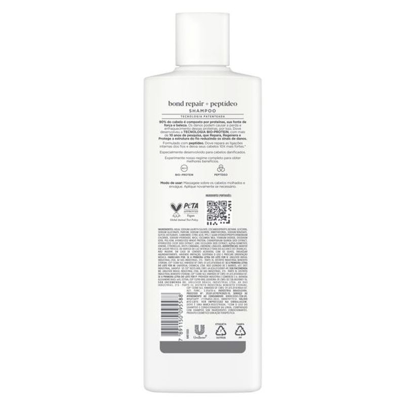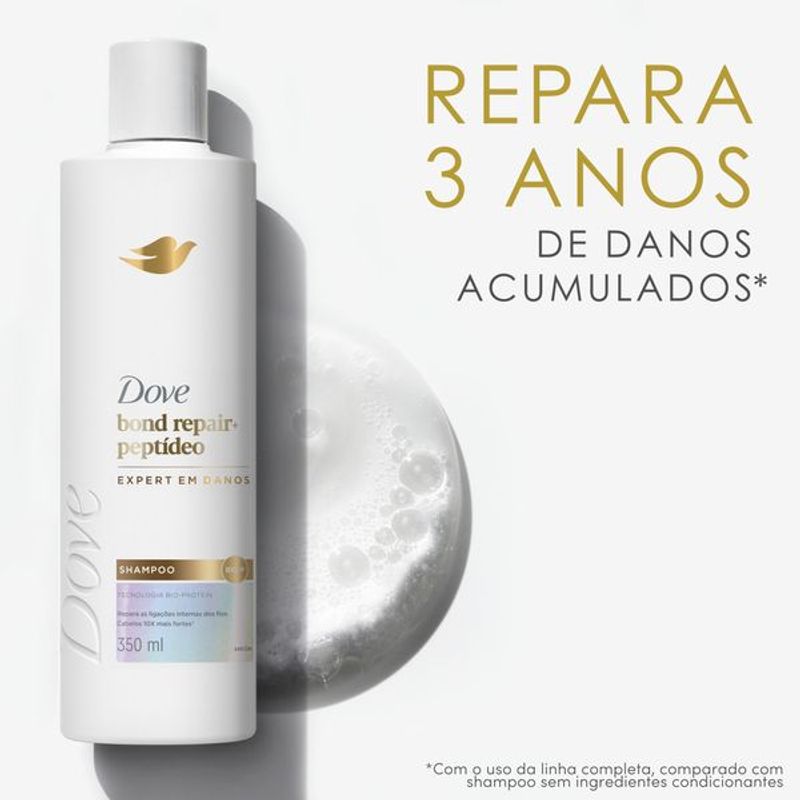 Ideal para reparar cabelos danificados, o shampoo Dove Bond Intense Repair + Petídeo Complex deixa o cabelo 10x mais forte e com fios 100% mais macios. Ele limpa suavemente o cabelo. reparando instantaneamente a aparência dos danos superficiais, além de reduzir quebras e combater as pontas duplas. Com extra brilho por 48 horas, ele garante um cabelo com aparência saudável, forte e mais bonito.